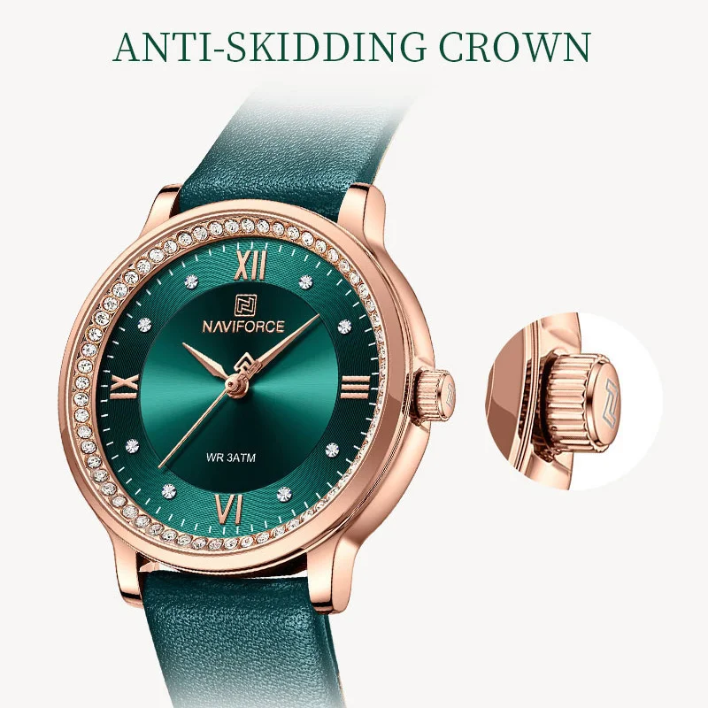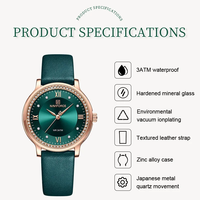 La montre-bracelet en cuir étanche pour femme NAVIFORCE NF5036 est un accessoire élégant et de haute qualité qui attire l’attention grâce à son nouveau design. Son cadran de 34mm de diamètre et son boîtier de 10.5mm d’épaisseur en font une montre minimaliste parfaite pour les femmes. Avec sa longueur de bande de 235mm et sa largeur de bande de 14mm, elle s’adapte confortablement à votre poignet. Son poids de seulement 33g la rend légère et agréable à porter.