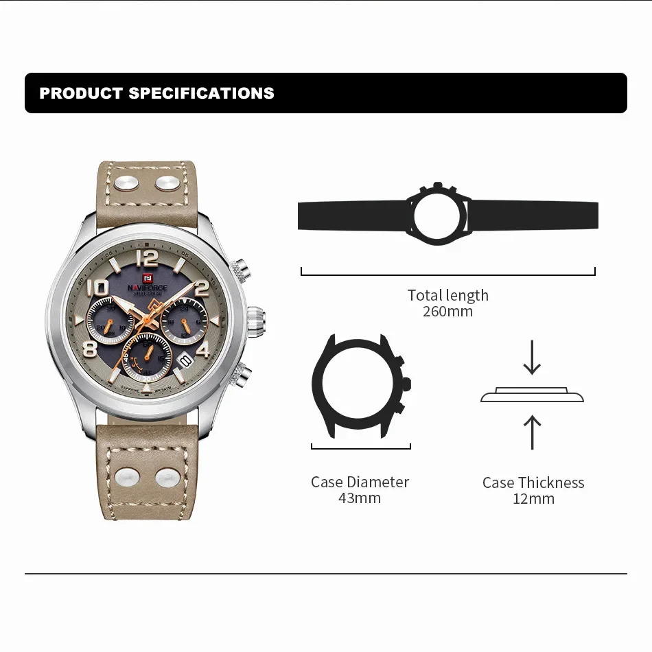 La longueur du bracelet des montres NAVIFORCE pour hommes est de 260mm, ce qui convient à la plupart des poignets masculins.