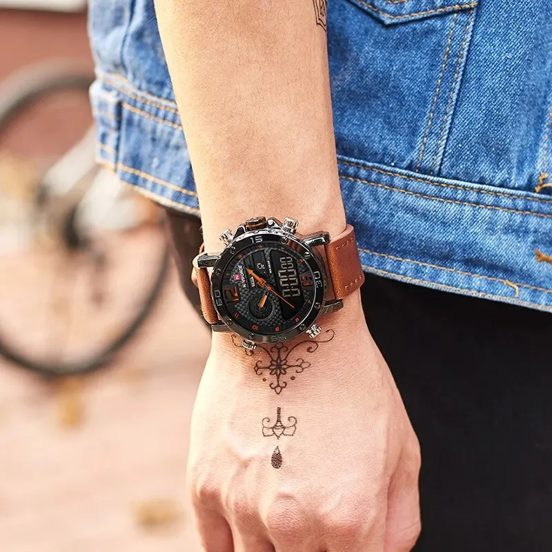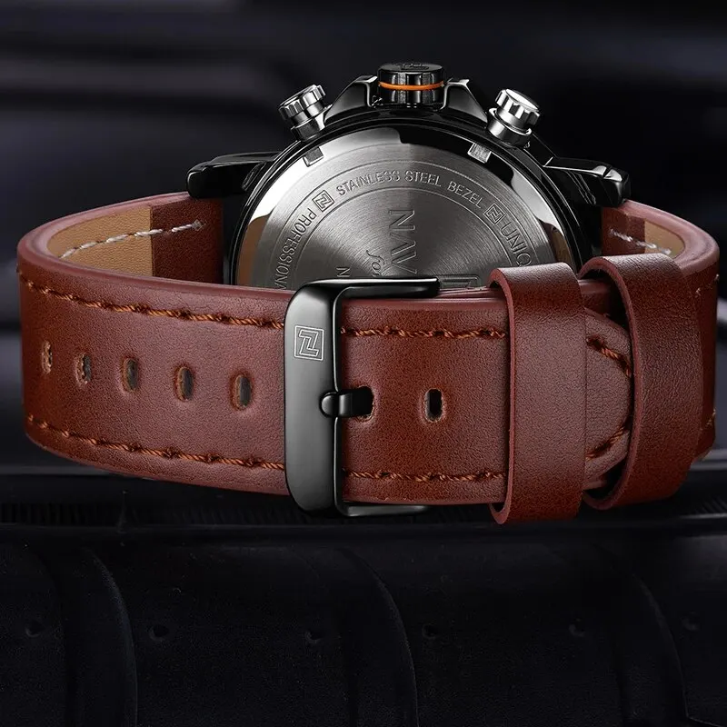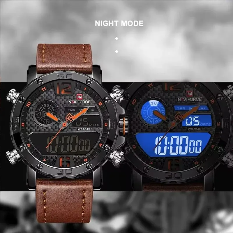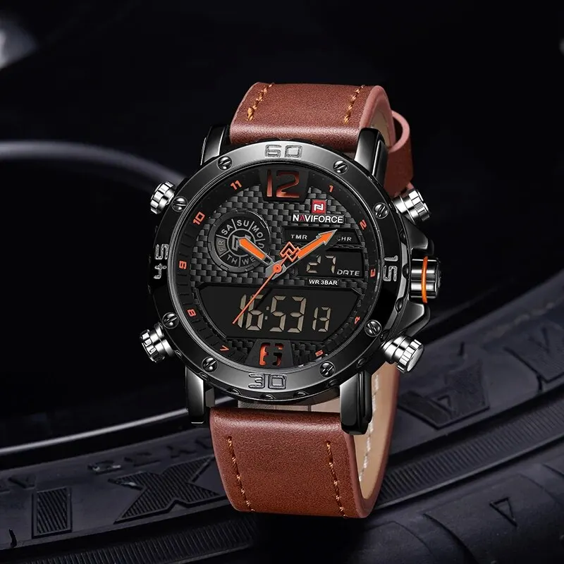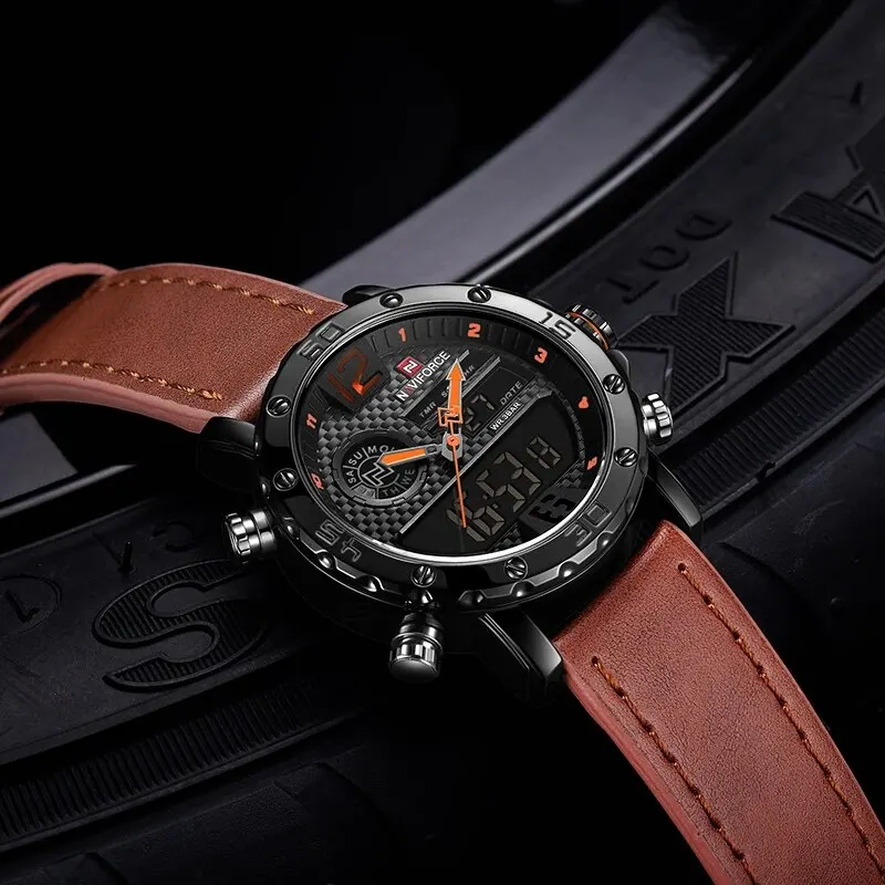 La montre de sport en cuir NAVIFORCE est une montre-bracelet militaire étanche de luxe. Elle dispose d’un mouvement à quartz LED et d’un cadran numérique. Son bracelet en cuir lui confère un aspect élégant. Le boîtier de la montre est en alliage, avec une forme ronde. Elle a une profondeur étanche de 3Bar, ce qui signifie qu’elle peut résister à de légères projections d’eau.