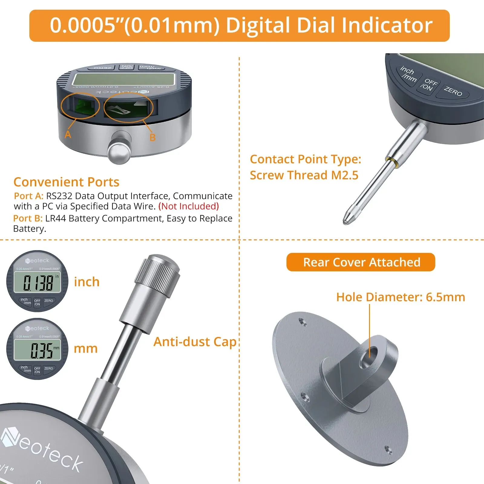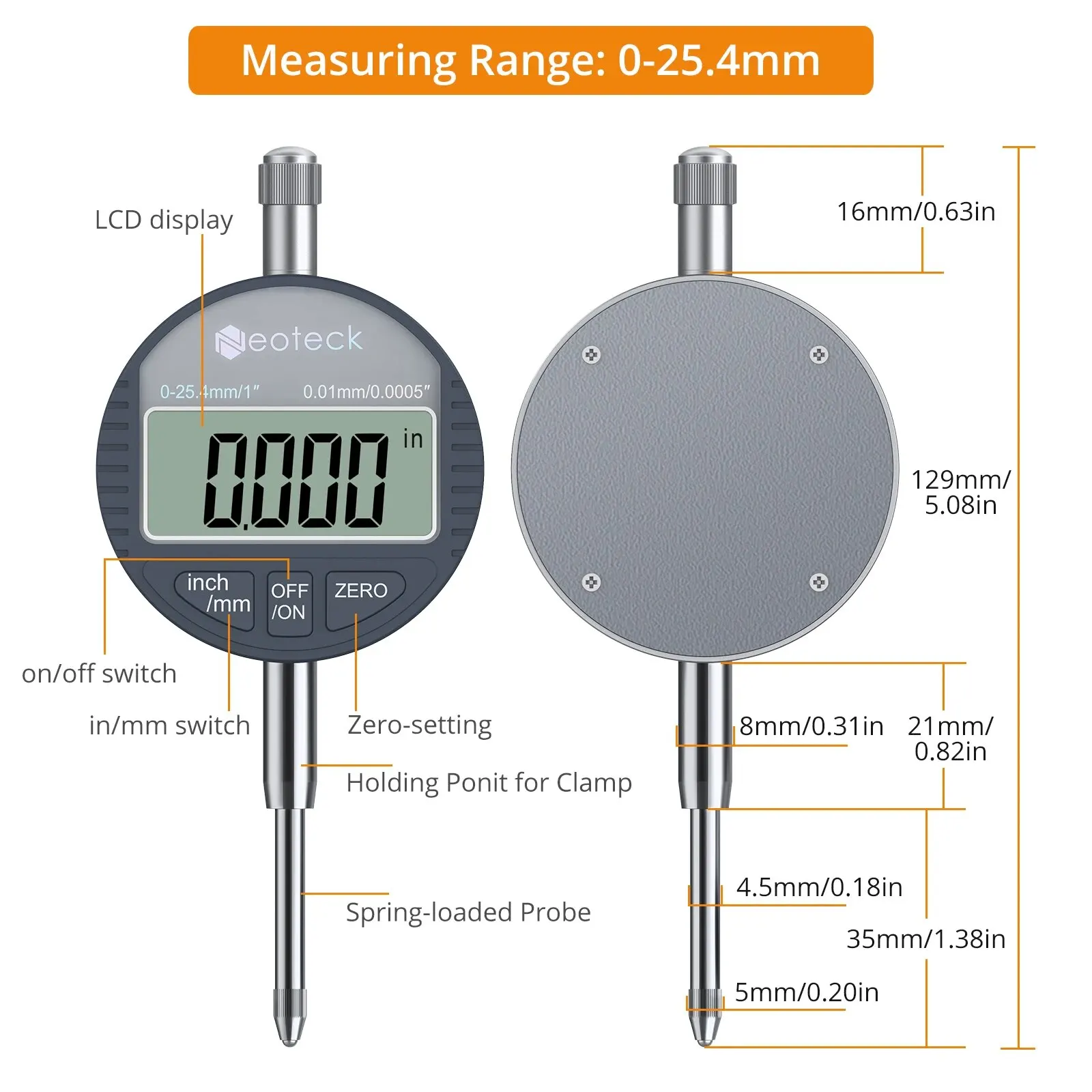 Ce produit de NEOTECK, l’outil de mesure électronique indicateur à cadran numérique DTI, est un outil précis et fiable pour mesurer de petites distances linéaires. Son grand écran LCD avec 3 chiffres facilite la lecture des mesures. Sa plage de mesure de 0 à 25.4mm offre une grande flexibilité d’utilisation. De plus, sa haute résolution jusqu’à 0.01mm garantit une précision maximale.