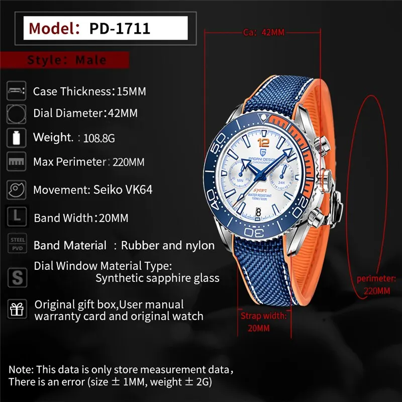 La montre de plongée à quartz Pagani pour homme est un nouveau produit de marque supérieure. Avec une étanchéité de 10 bars, elle peut résister à une pression d’eau allant jusqu’à 100 mètres de profondeur, en faisant un choix idéal pour les activités aquatiques telles que la natation et la plongée. Son cadran en cristal saphir est non seulement résistant aux rayures, mais aussi durable, ce qui garantit que le visage de la montre reste clair et facile à lire. Le boîtier en acier inoxydable de la montre ajoute à sa longévité et à sa durabilité globale, grâce à sa résistance à la corrosion. Le mouvement à quartz assure une précision et une fiabilité constantes pour garder le temps avec précision. Avec son design sportif, cette montre est à la fois pratique et élégante.