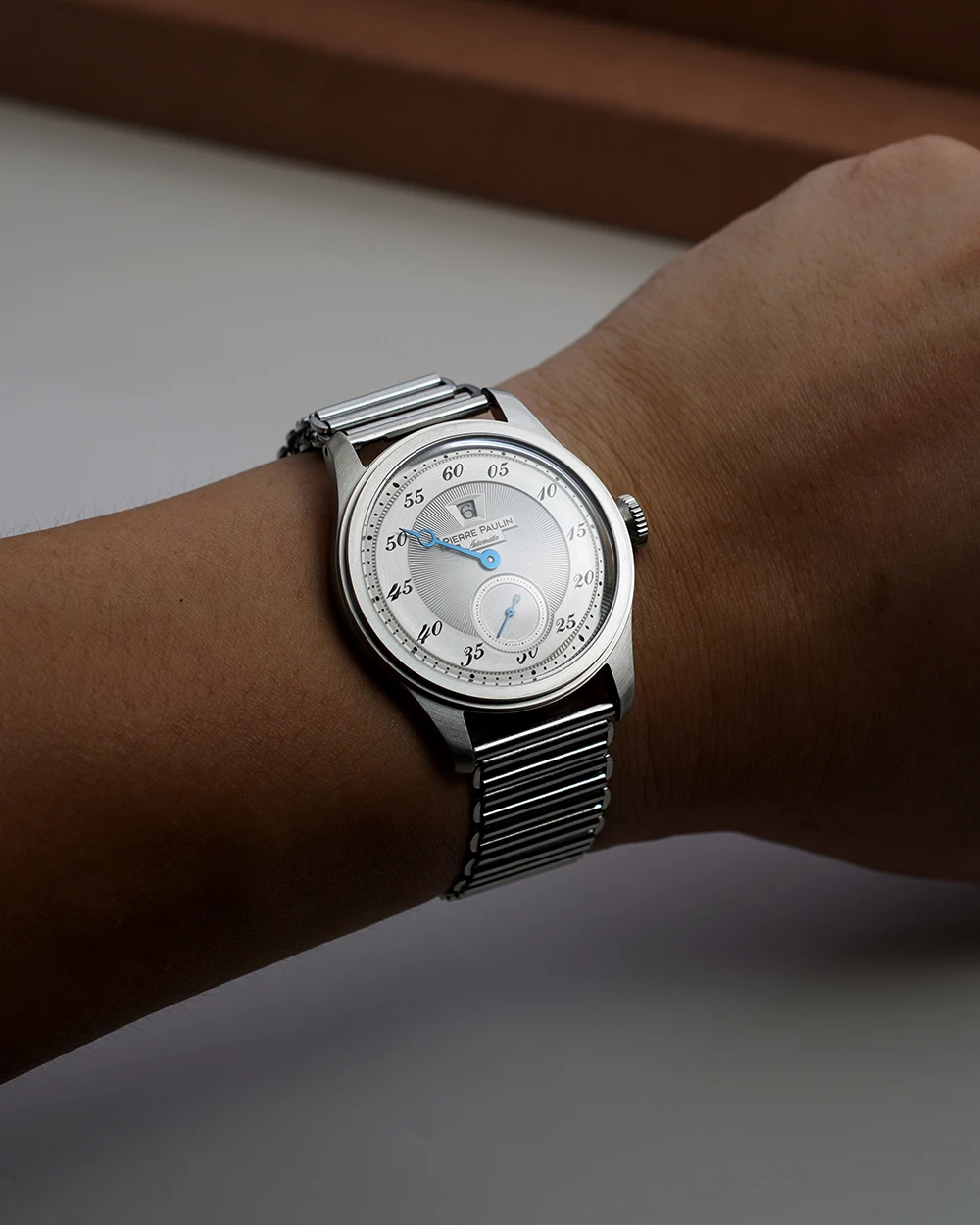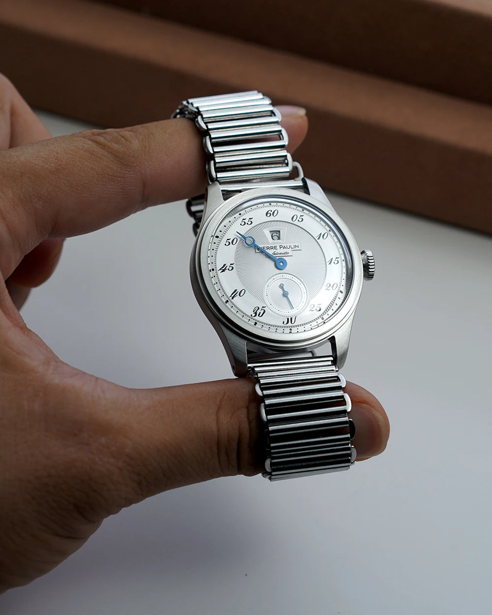La Pierre Paulin Jumping Hour Montre Homme est une montre mécanique vintage avec un cadran argenté. Elle possède une fenêtre de date et un mouvement Seagull ST17. Le diamètre du boîtier est disponible en 38mm ou 36mm, et la largeur du bracelet en 20mm ou 18mm. La patte à crampon mesure 47mm ou 45mm. Le bracelet est disponible en cuir ou en métal, et le verre est en dôme K1. Cette montre est étanche jusqu’à 50m ou 5atm.