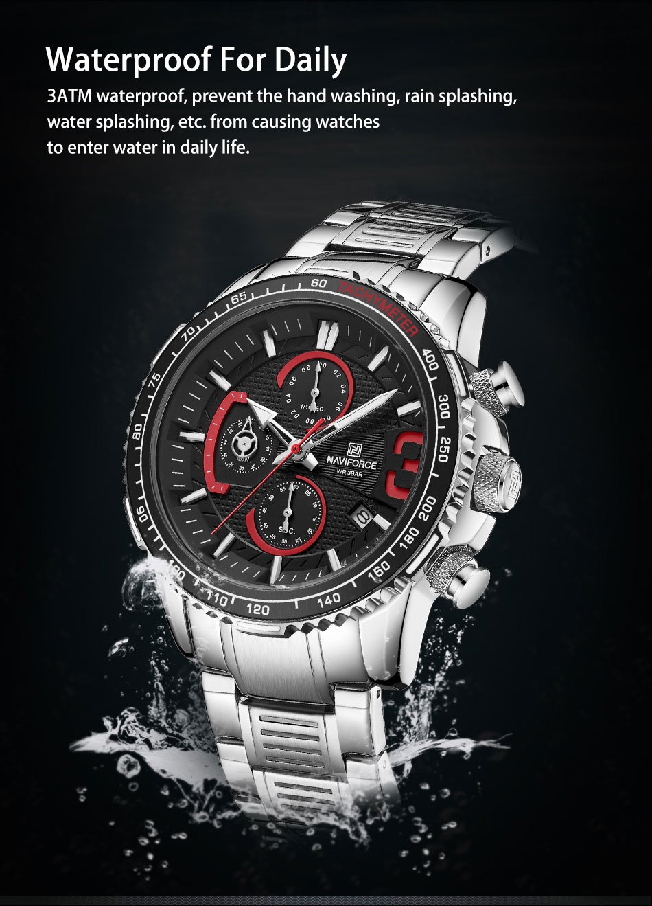 La NAVIFORCE NV24 – Cardan Noir Rouge est également étanche jusqu’à 30 mètres, résistante aux chocs et dotée d’un verre minéral ultra résistant qui protège la montre des rayures.