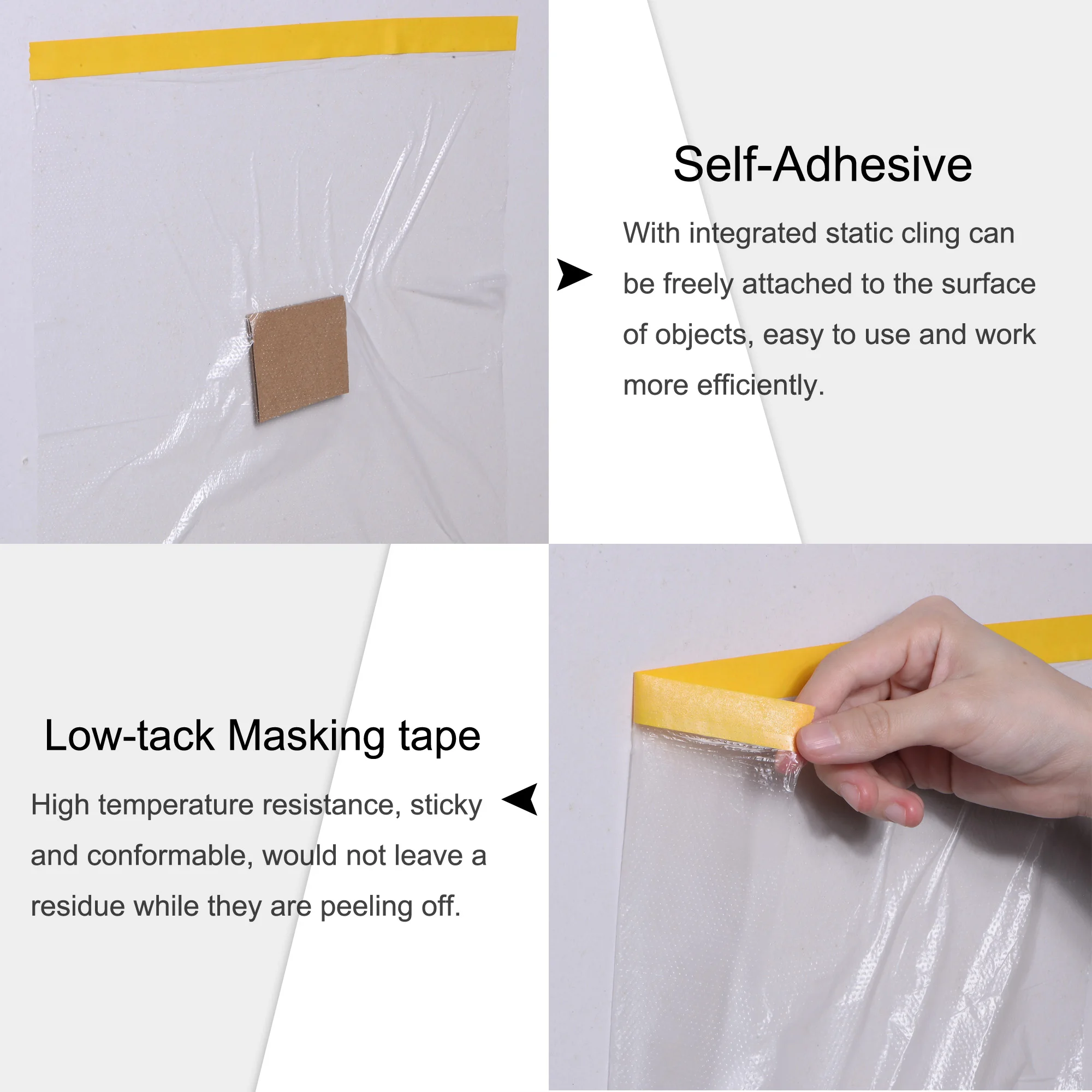 - Léger et s’accrochent par statique. Lorsque des feuilles de plastique sont recouvertes, elles peuvent être librement fixées à la surface d’objets tels que des meubles et des murs pour assurer une protection complète.