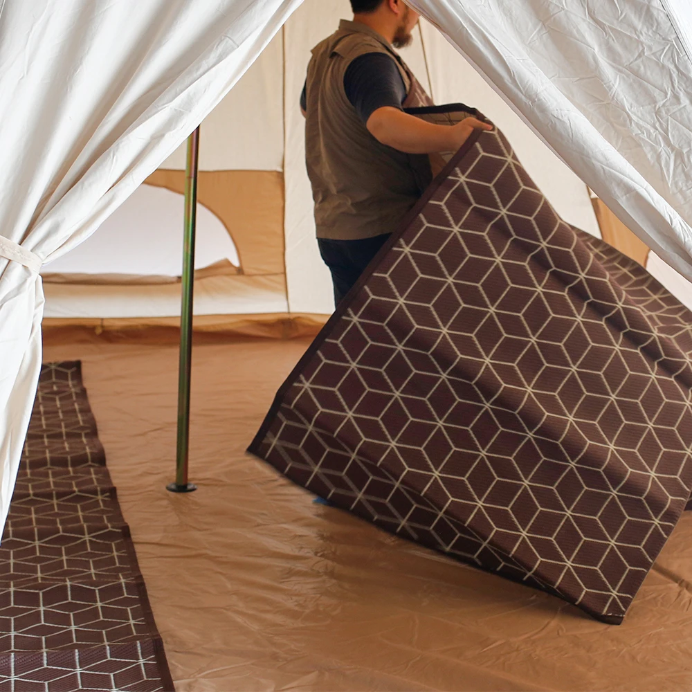 Ce tapis de tente cloche en polypropylène léger est facile à nettoyer et donne à votre sol de tente cloche encore plus de confort. Disponible pour les tentes cloches de 4m, 5m et 6m.