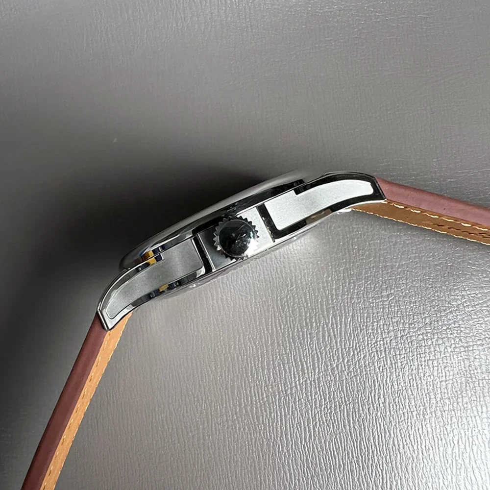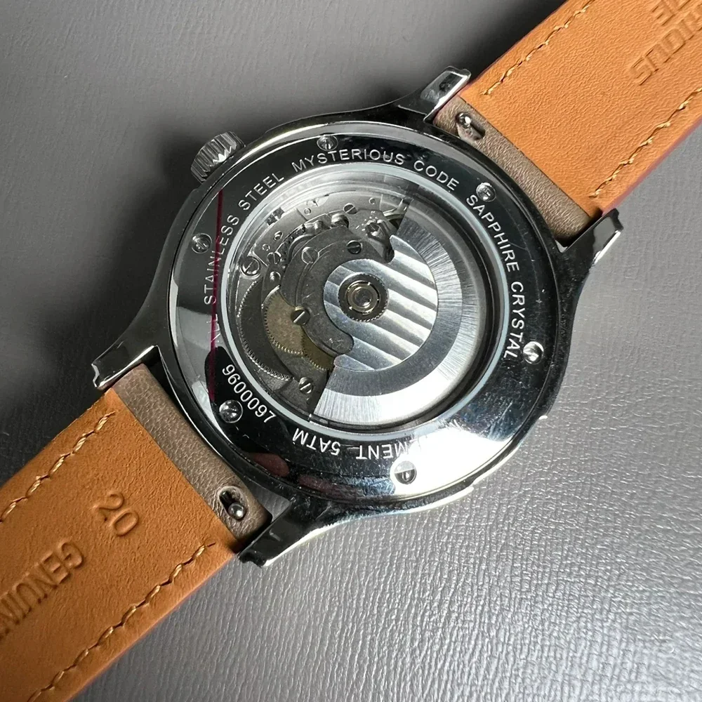 La montre de pilote vintage « Mysterious Code » pour homme est une montre-bracelet mécanique automatique avec un mouvement PT5000. Le boîtier de haute qualité est fabriqué en acier inoxydable 316L et a un diamètre de 42.00mm avec une épaisseur de 12.00mm. Le bracelet est en cuir et a une largeur de 20.00mm.