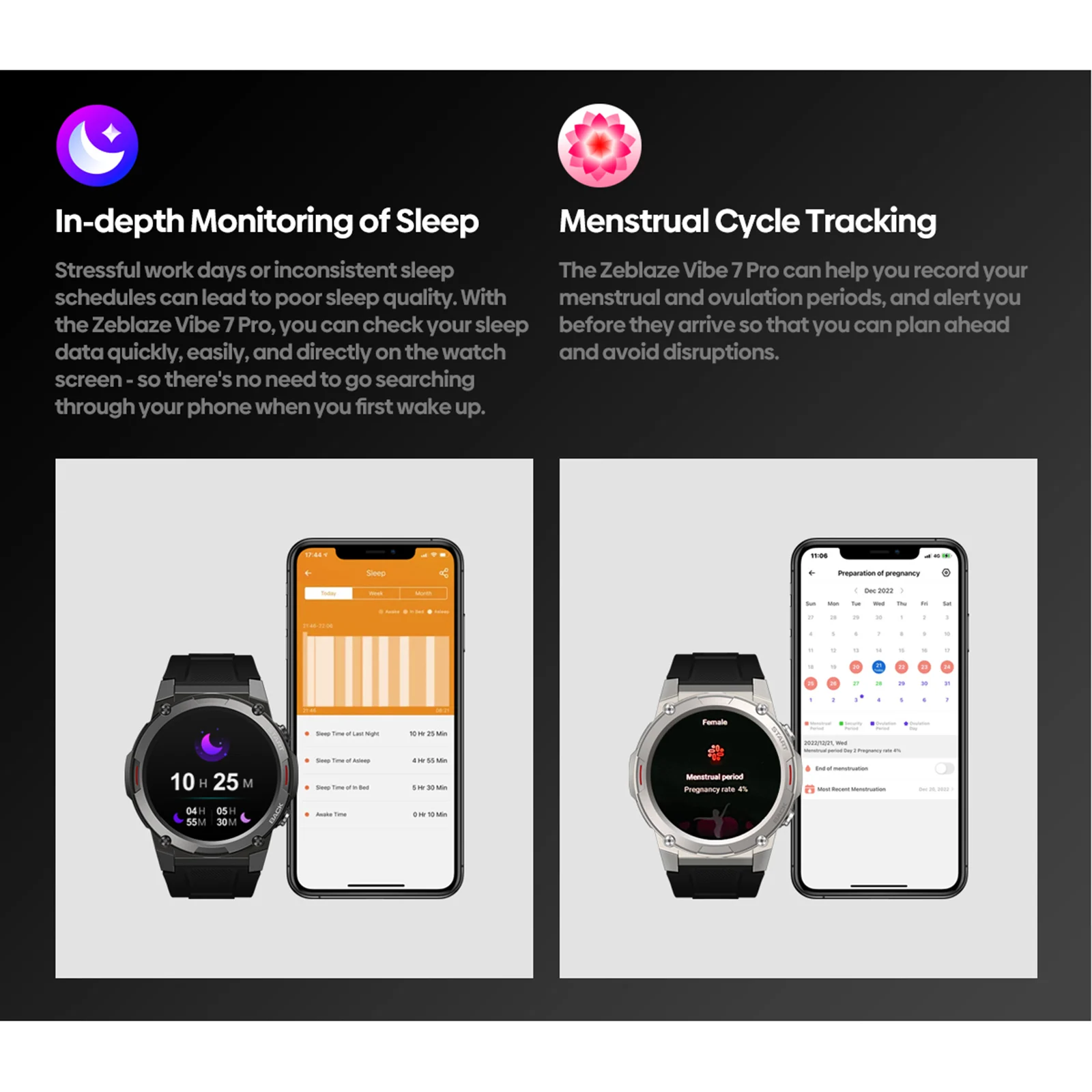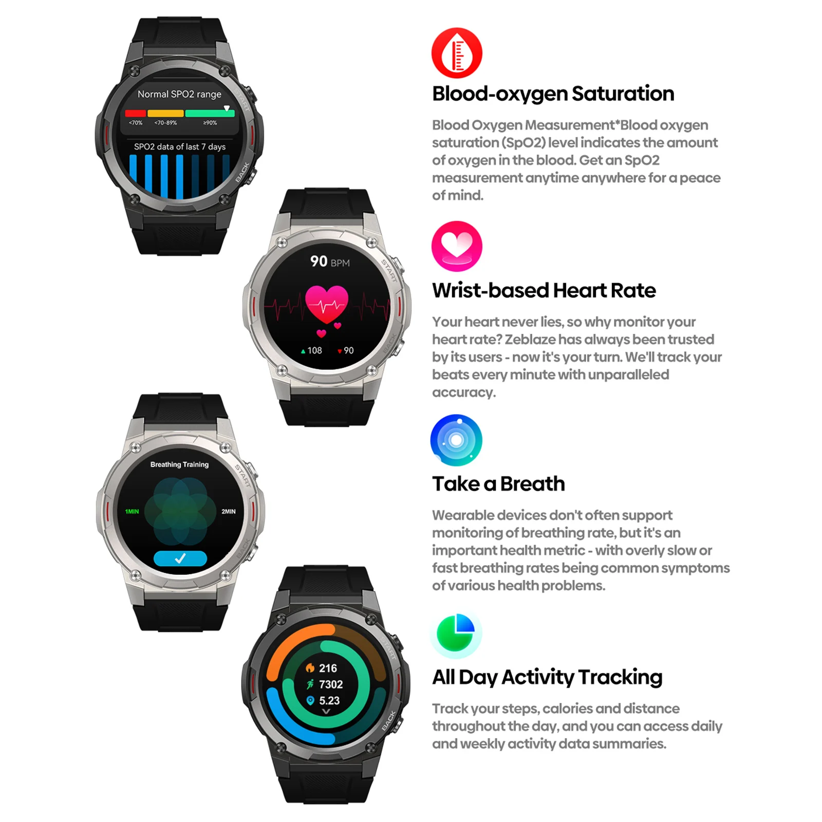 - Moniteur de santé avec suivi précis de la fréquence cardiaque, de la pression artérielle, de l’oxygène sanguin et des données de sommeil